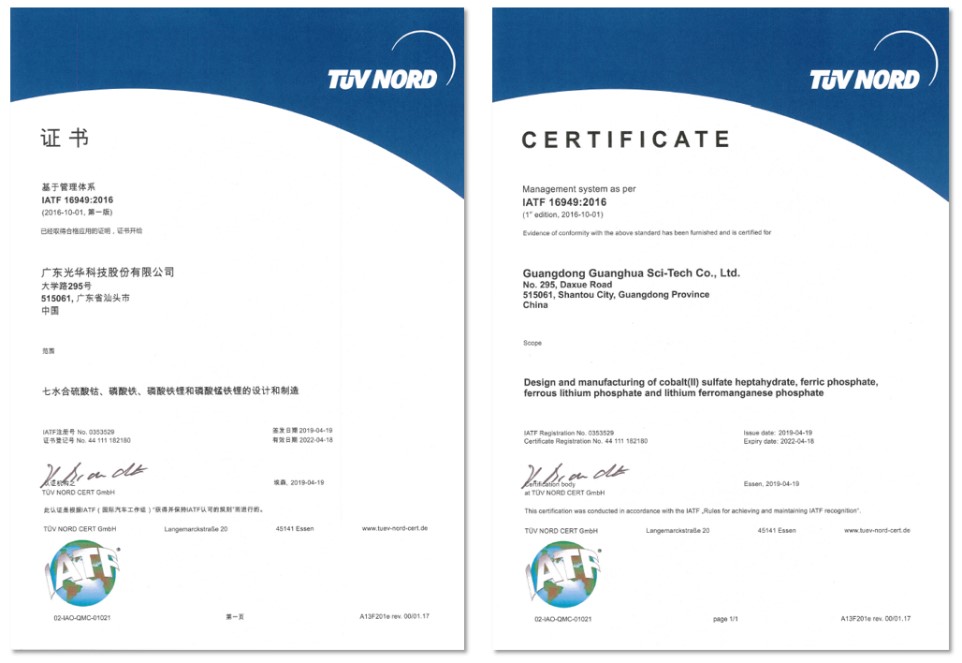 目前,經(jīng)過不懈努力,公司的七水合硫酸鈷、磷酸鐵、磷酸鐵鋰和磷酸錳鐵鋰近日順利通過了IATF16949:2016認證,這意味著上述產(chǎn)品的設(shè)計及制造達到汽車行業(yè)質(zhì)量管理的先進水平,產(chǎn)品品質(zhì)更加穩(wěn)定可靠。